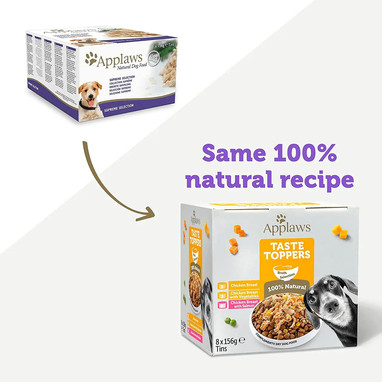 Elevate mealtime excitement with Applaws Taste Toppers; Broth Tin Selection – 8 Pack. Delight your dogs taste buds with irresistible flavors, added nutrition, varied textures, and enhanced moisture in every bowl.