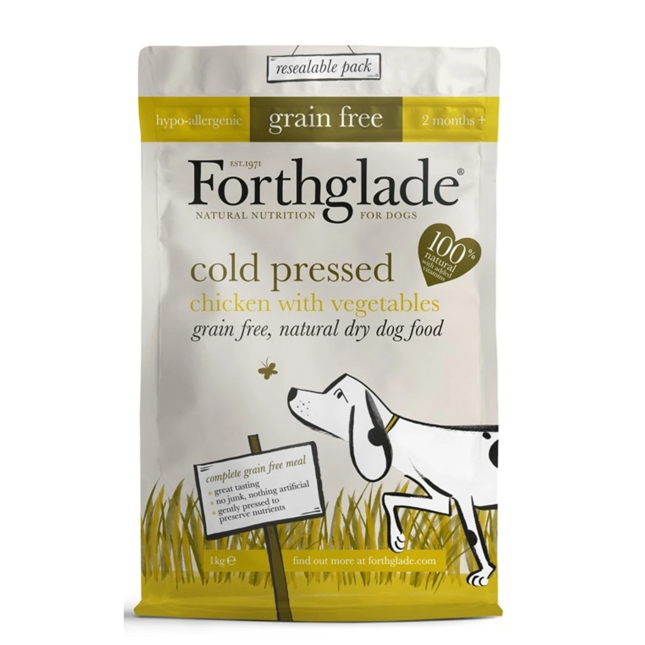 Chicken grain free cold pressed natural dry dog food.