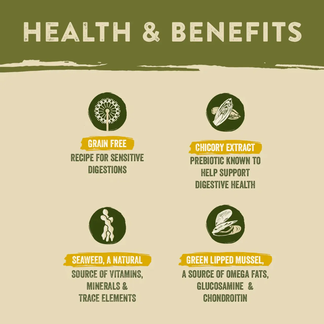 The recipe has been carefully formulated to provide wholesome grain free nutrition and contains no artificial colours or flavours, no dairy, no soya and no added wheat.