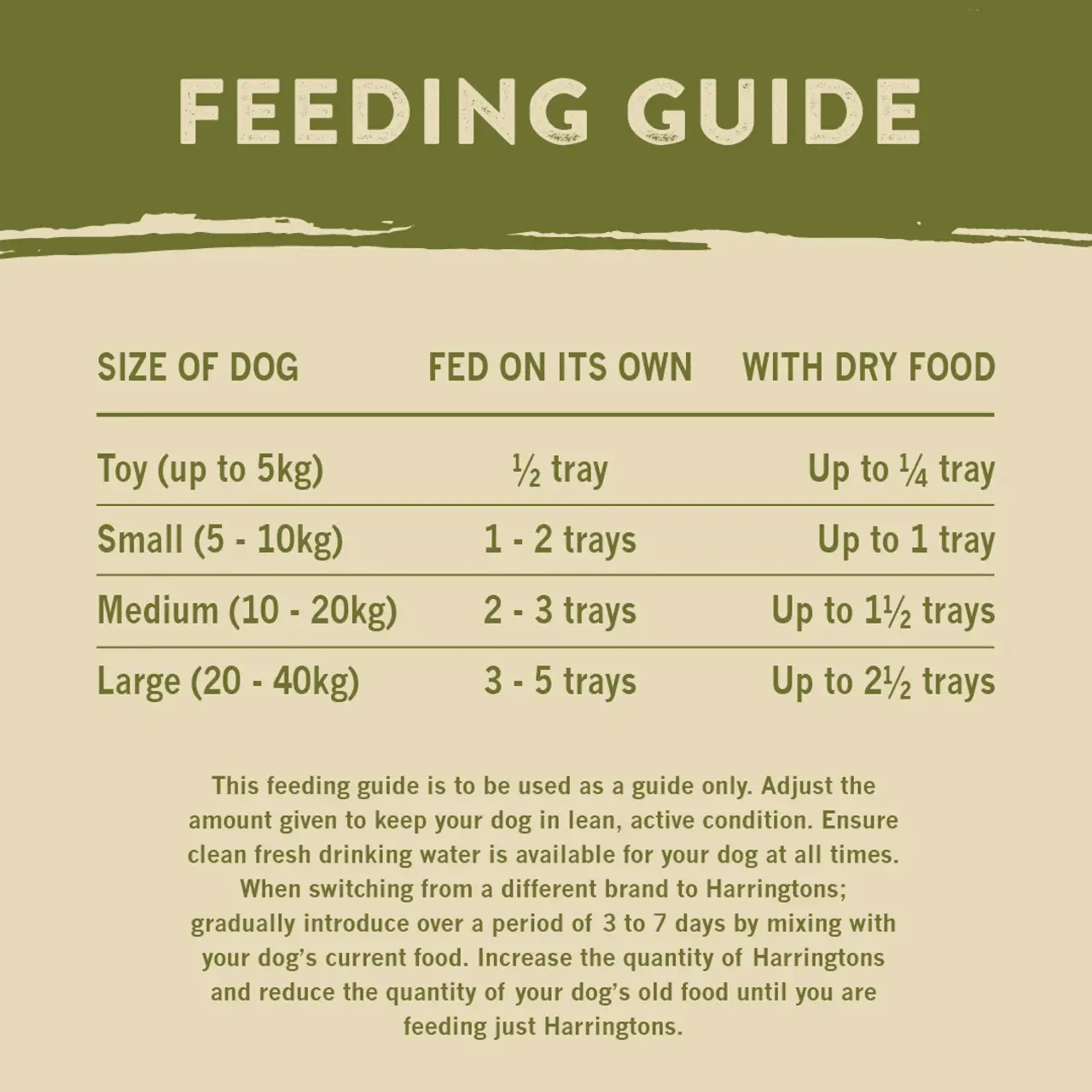When switching from a different brand to Harringtons; gradually introduce over a period of 3 to 7 days by mixing with your dog’s current food. Increase the quantity of Harringtons and reduce the quantity of your dog’s old food until you are feeding just Harringtons.