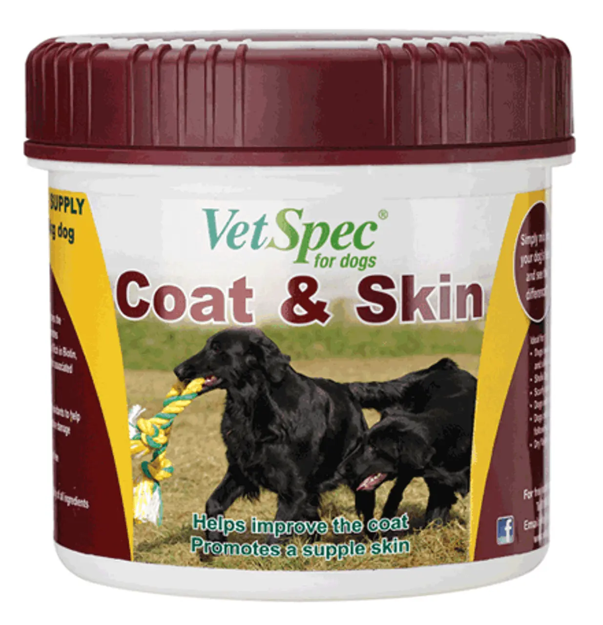 VetSpec Coat & Skin’s unique formula promotes fabulous coats, wonderful skin condition and aids the natural pigmentation process. It is ideal for show dogs, dogs with scruffy coats and itchy skin, and dogs recovering from a variety of skin conditions. Improve your dogs coat with a fine blend of Vitamins, Minerals, Anti-oxidants and MSM.